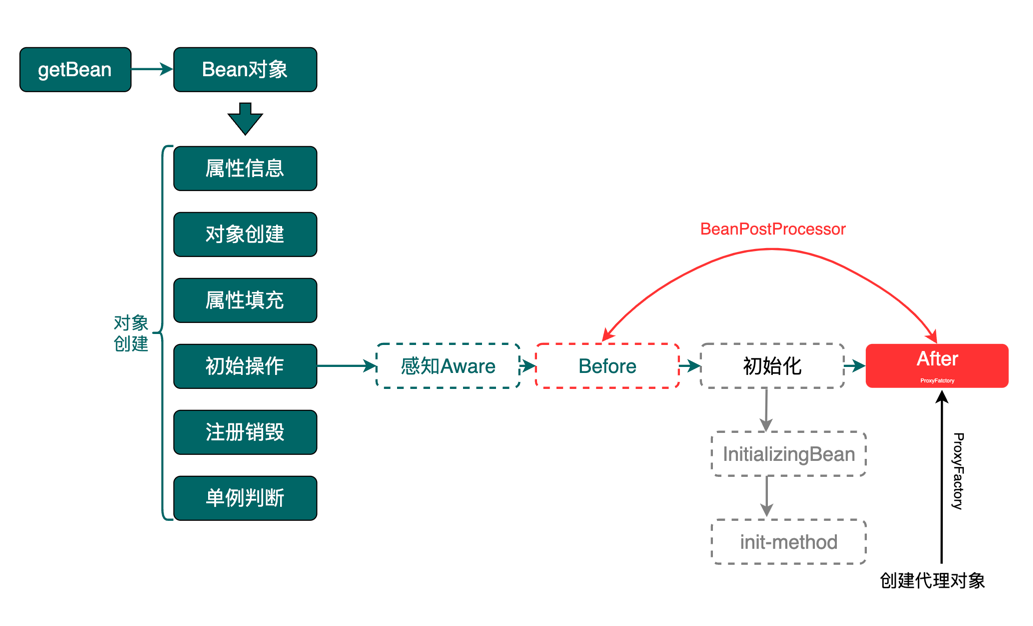 核心知识内容主要是完善了 Bean 的生命周期,在创建类的操作中完成代理对象的创建,通过这样的方式就可以让代理对象中的属性也可以随着创建过程被填充进去。