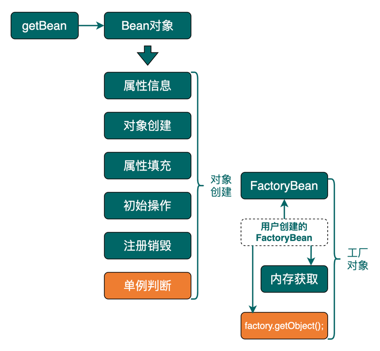 - 整个的实现过程包括了两部分,一个解决单例还是原型对象,另外一个处理 FactoryBean
