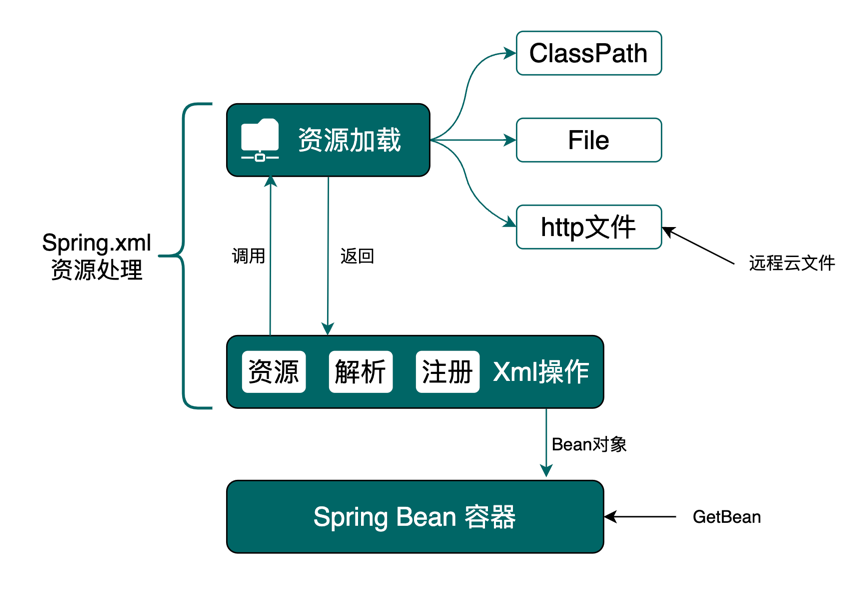 - 以配置文件为入口解析和注册 Bean 信息,最终再通过 Bean 工厂获取 Bean 以及做相应的调用操作。