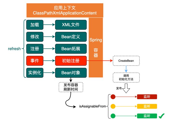 - 注册事件监听器(registerListeners),通过 getBeansOfType 方法获取到所有从 spring.xml 中加载到的事件配置 Bean 对象。