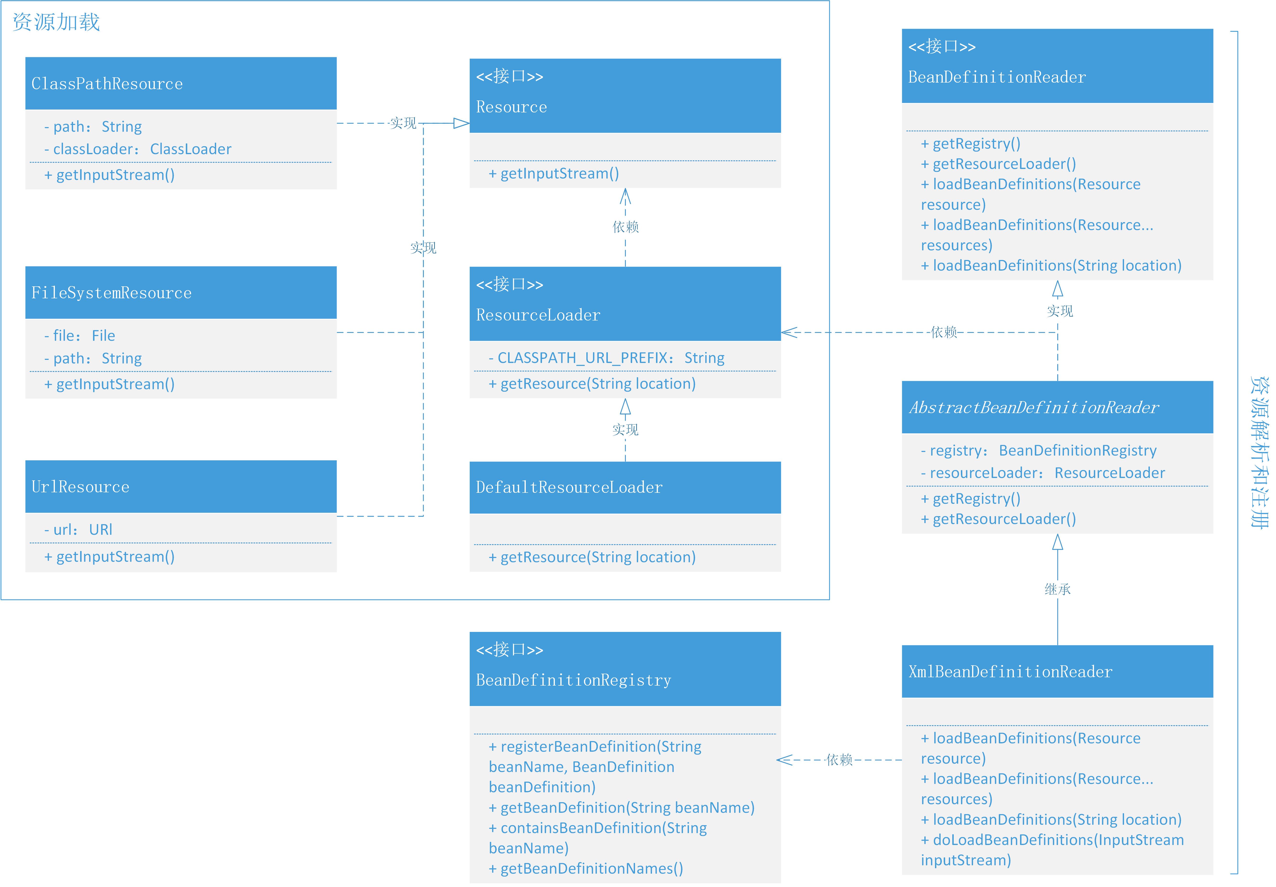 DefaultResourceLoader 中做具体的调用。 - 接口:BeanDefinitionReader、抽象类:AbstractBeanDefinitionReader、实现类:XmlBeanDefinitionReader,这三部分内容主要是合理清晰的处理了资源读取后的注册