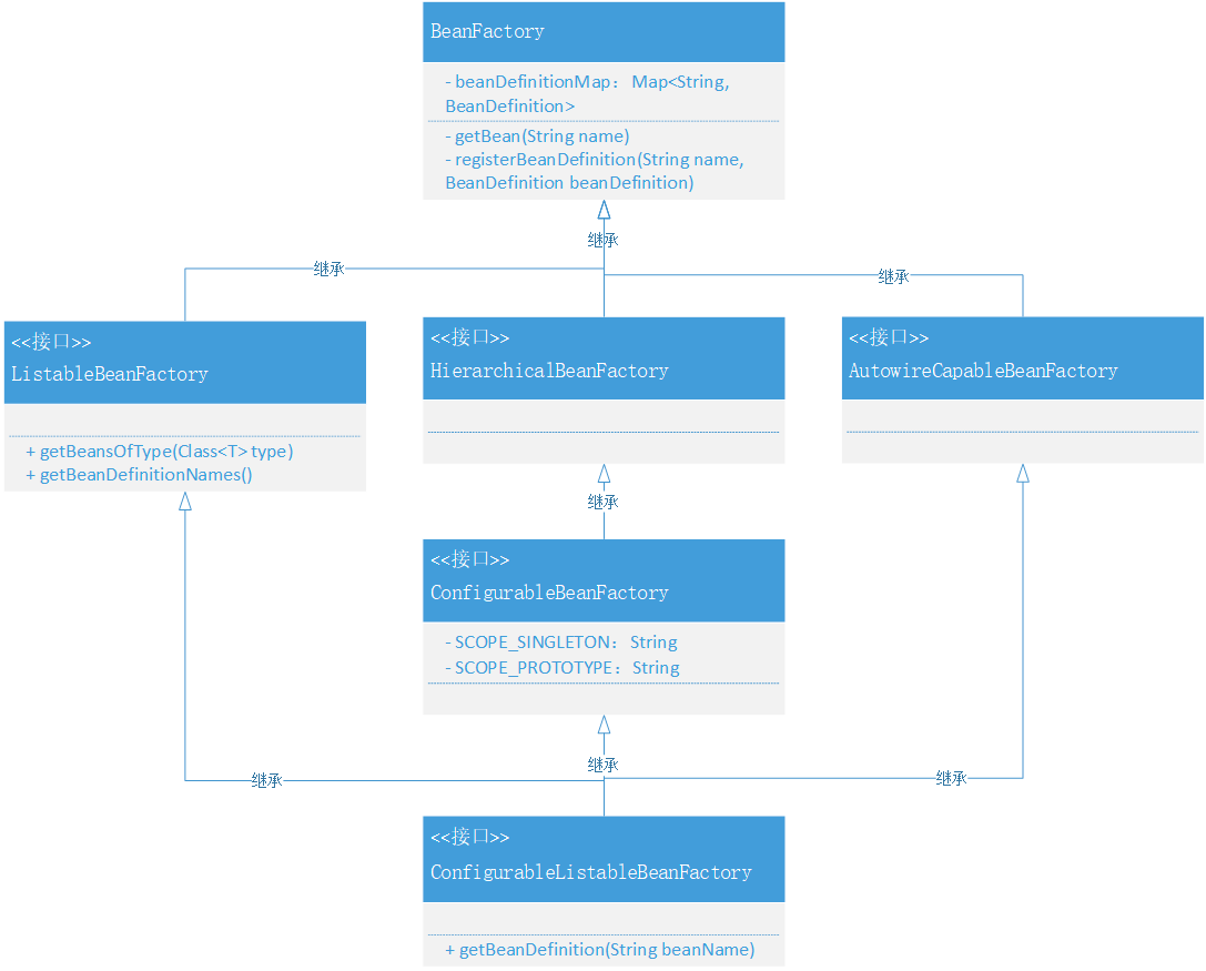 核心类结合起来,因为你所有的解析后的注册动作,都会把 Bean 定义信息放入到这个类中。 - 那么在实现的时候就设计好接口的实现层级关系,包括我们需要定义出 Bean 定义的读取接口
